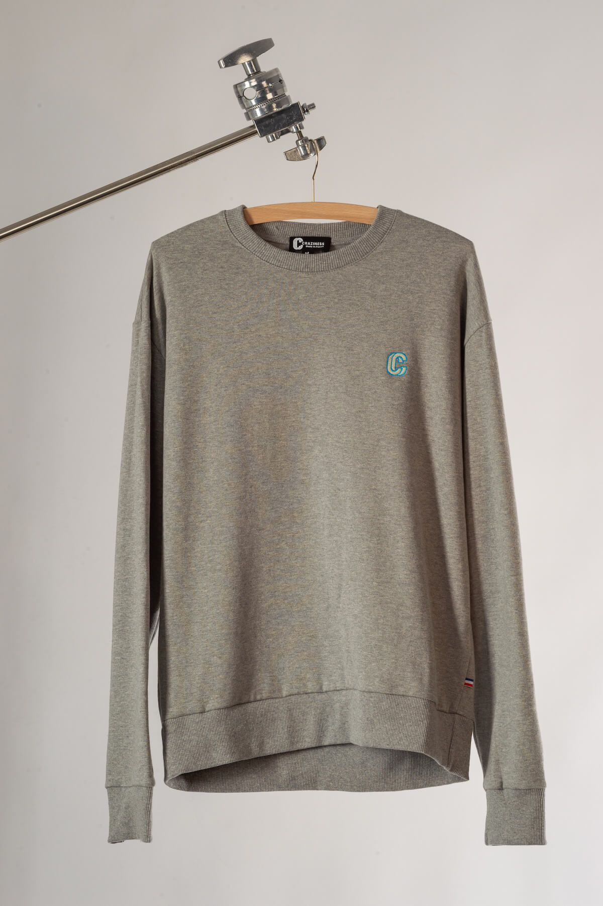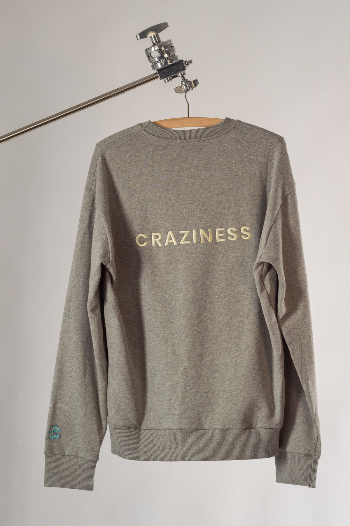The Madness Crewneck in grey with the Craziness signature logo embroidered in turquoise blue. Made from organic cotton.