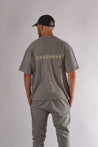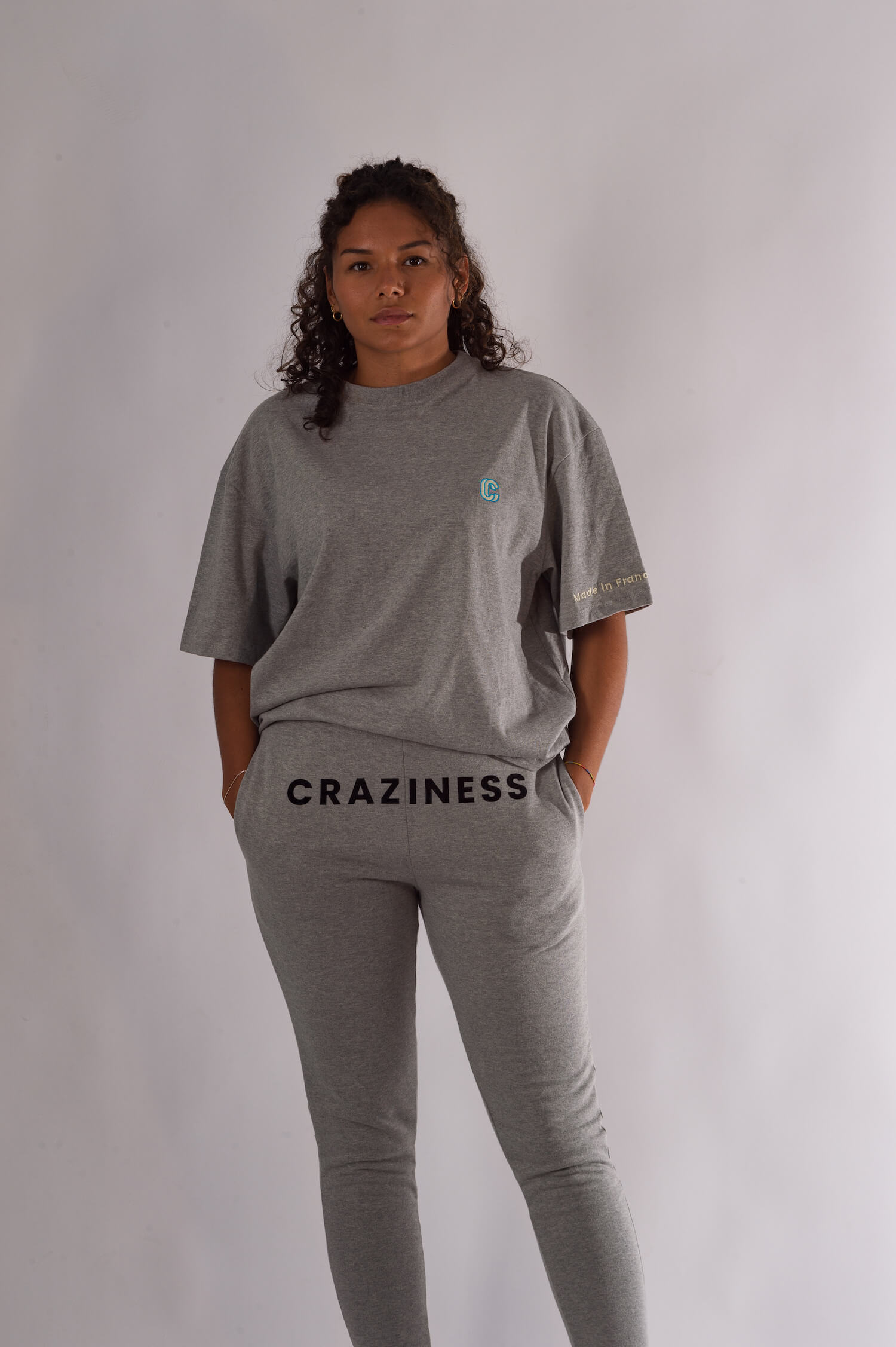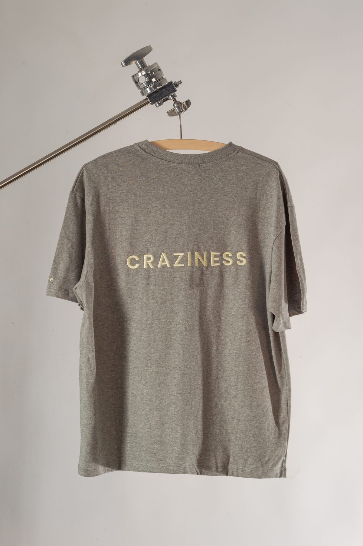 The Outrageous T-shirt in grey is made from organic cotton and embroidered with the Craziness logo and the signature Locked Mini Logo in turquoise blue.